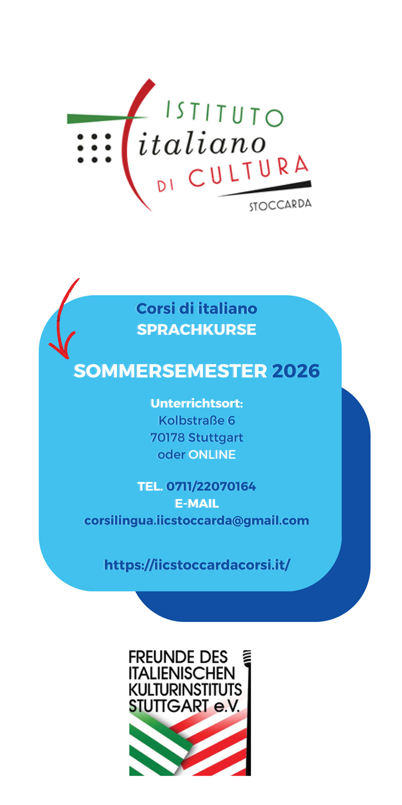 11. Wochenendkurs A1.b, SoSe 2025 Kursbeginn: 21/03/2025 Freie Plätze: 9 Anmeldung Herr/Frau Frau Herr Vorname Name E-Mail: Geboren am Adresse: Stadt PLZ: Telefon Newsletter Ja Nein Hiermit erkläre ich mich damit einverstanden, dass meine bei der Anmeldung angegebenen Daten von Freunde des Italienischen Kulturinstituts e. V. zum Zwecke der Zusendung von Informationen über Kurse und Kulturveranstaltungen vom Italienischen Kulturinstitut Stuttgart im Einklang mit der Datenschutzerklärung [URL zu der Erklärung platzieren] verarbeitet werden. Diese Einwilligung ist freiwillig und kann jederzeit mit Wirkung für die Zukunft gegenüber Freunde des Italienischen Kulturinstituts e.V. unter corslin.iicstuttgart@esteri.it widerrufen werden Hiermit bestätige ich, die AGBs zur Kenntnis genommen zu haben und akzeptiere diese. Anmeldung